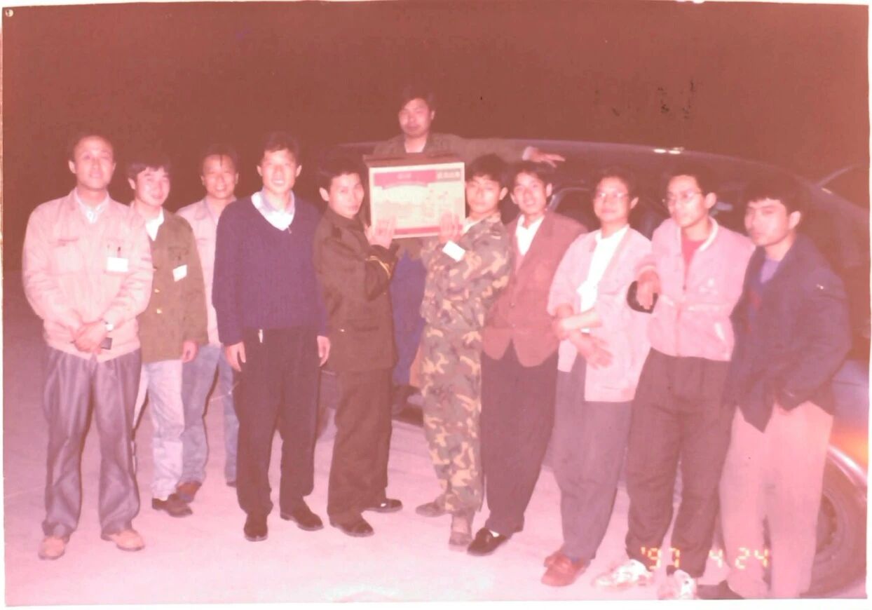 ▲ 1997年農(nóng)夫山泉第一款產(chǎn)品(4L天然水)出廠,方強(qiáng)(居中)和同事一起合影留念